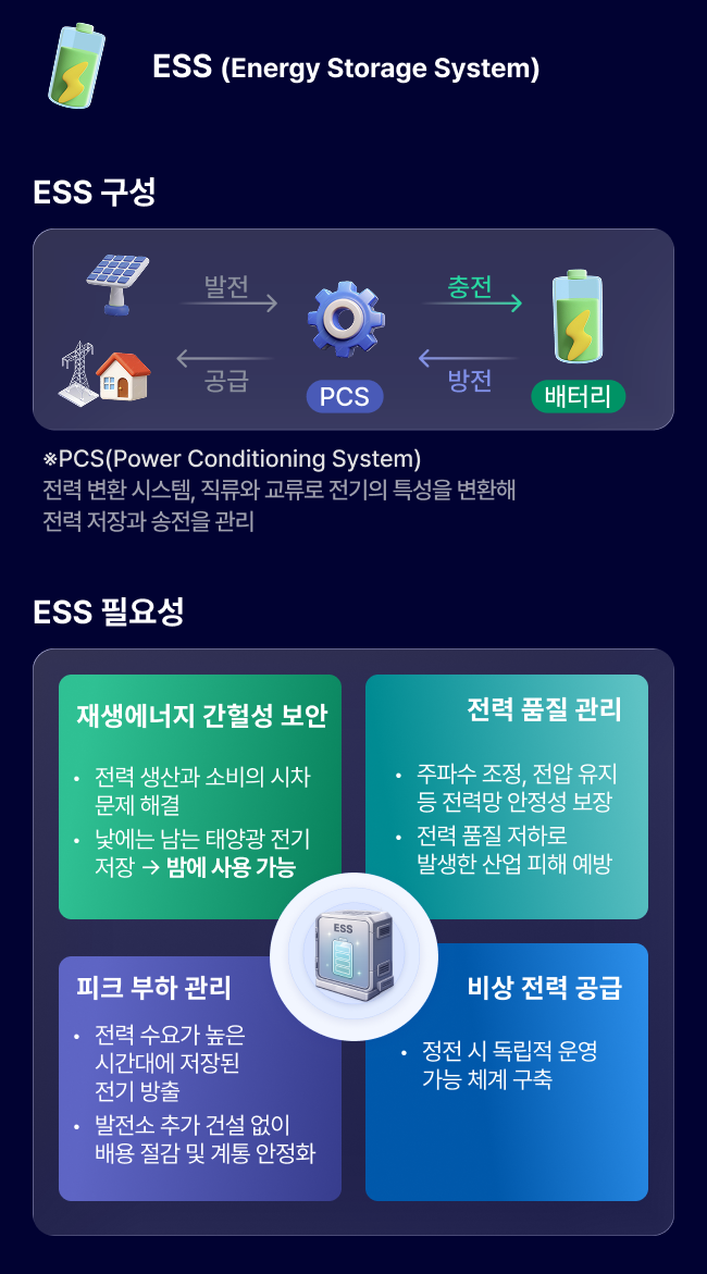 하지만 스마트그리드와 마이크로그리드가 제대로 작동하기 위해서는, 여전히 풀어야 할 과제가 있습니다. 재생에너지는 날씨나 환경에 따라 발전량이 들쭉날쭉하는 ‘재생에너지의 간헐성’ 문제죠. 이 불안정성을 보완하고, 전력 수급의 균형을 맞춰주는 핵심 해법이 바로 ESS(Energy Storage System, 에너지저장장치)입니다. ESS는 낮 동안 남는 태양광 전력을 저장했다가 밤에 사용하거나, 전력 수요가 급증하는 피크 시간대에 방출함으로써 전력망을 안정적으로 유지할 수 있습니다. 나아가 전력 품질 관리, 피크 부하 완화, 비상 전력 공급, 수익화 등 다양한 측면에서 미래 전력 운영의 핵심 인프라로 자리 잡고 있습니다. |