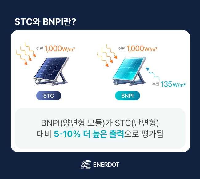 최근 태양광 업계의 가장 큰 이슈 중 하나는 바로 BNPI(Bifacial Nameplate Irradiance) 기준의 도입입니다. 기존의 STC(Standard Test Conditions)가 단면 모듈 기준으로 만들어져 양면형 모듈의 특성을 제대로 반영하지 못한다는 한계가 있었는데요. BNPI는 전면뿐 아니라 후면 발전까지 고려한 새로운 성능 측정 기준으로, 실제 발전 환경을 더 정확히 반영할 수 있게 합니다. 그만큼 향후 발전소 설계, 수익 구조, 인허가 절차까지 폭넓게 영향을 미칠 전망입니다.