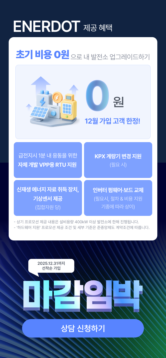에너닷은 준중앙제도 준비에 필요한 제어·데이터 인프라를 원스톱으로 구축할 수 있는 12월 한정 프로모션을 준비했습니다. 제도 참여에 필수적인 기술 지원을 초기 비용 부담 없이 받아보실 수 있는 기회이니, 이번 혜택을 놓치지 마세요!