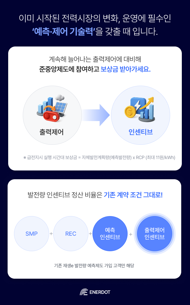 출력제어는 앞으로 더욱 빈번해질 가능성이 매우 높습니다. 재생에너지 설비가 급증하면서 출력제어는 피할 수 없는 운영 요소가 되었고, 향후 입찰 제도가 도입되면 발전소는 상시 제어 가능 상태를 갖추는 것이 기본 요건이 될 가능성이 높습니다. 이때 중요한 건 “제어되느냐”가 아니라 “제어에 대한 보상을 받을 준비가 되어 있느냐”인 것이죠.